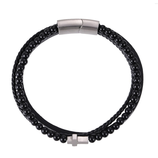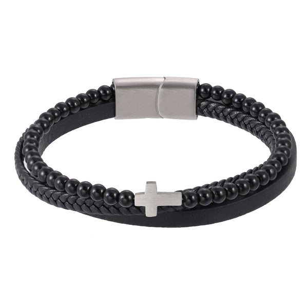 MBSS256 STAINLESS STEEL LEATHER BRACELET WITH CROSS & BEADS MBSS256 STAINLESS STEEL LEATHER BRACELET WITH CROSS & BEADS