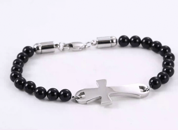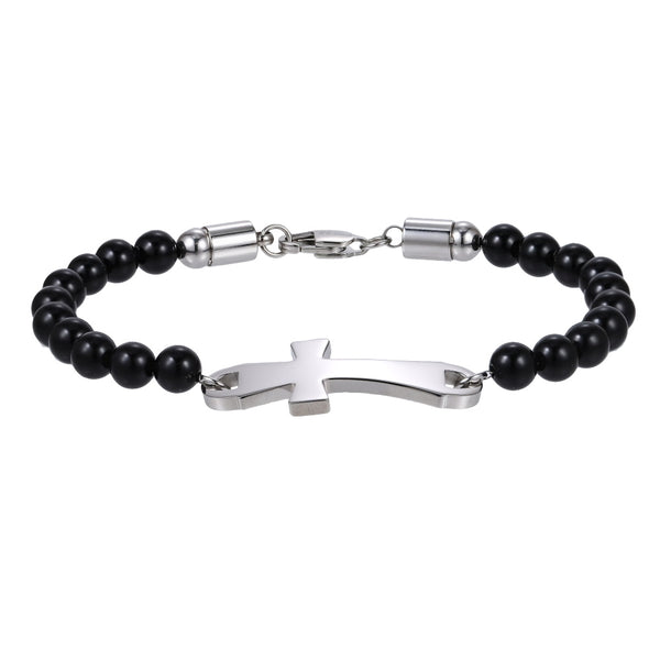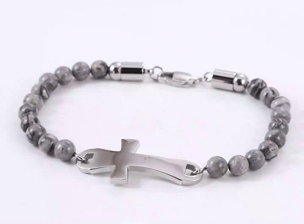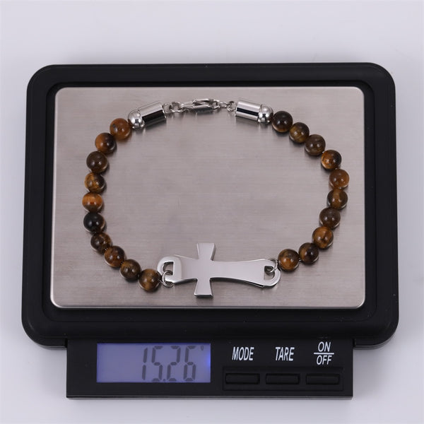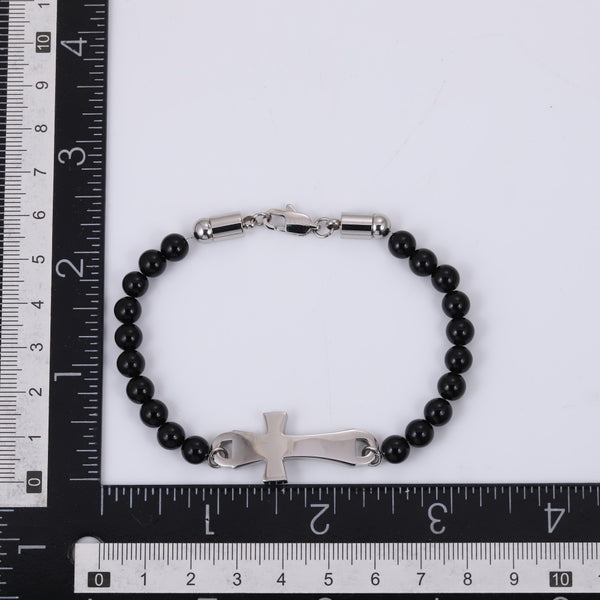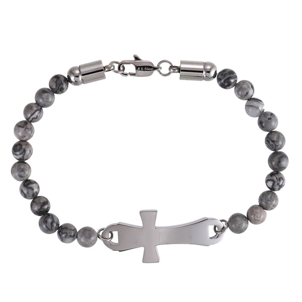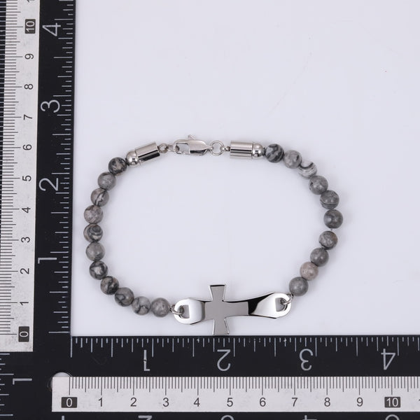 < img height="1" width="1" style="display:none" src="https://www.facebook.com/tr?id=1345682893308291&ev=PageView&noscript=1" /> BSS1133 STAINLESS STEEL NATURAL STONE BEADS BRACELET WITH CROSS