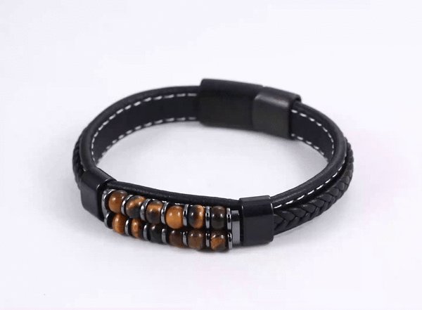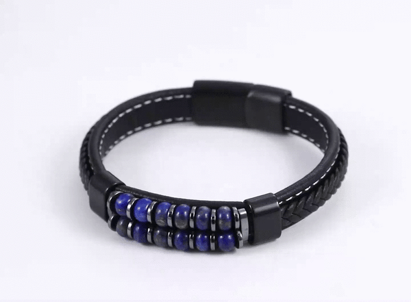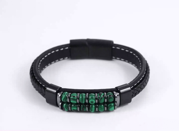MBSS253 STAINLESS STEEL LEATHER BRACELET WITH HEMATITE & STONE MBSS253 STAINLESS STEEL LEATHER BRACELET WITH HEMATITE & STONE